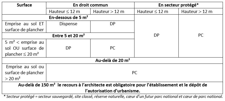 La surface de plancher ET l’emprise au sol permettent de déterminer l’autorisation à demander et si le recours à un architecte s’avère être obligatoire. Les tableaux ci-dessous peuvent vous aider.